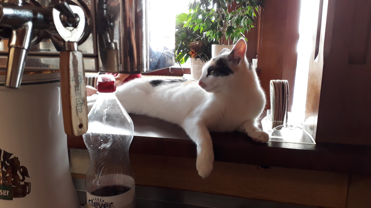 Hier im Gasthaus ist Finis Reich, vor den Gästen hat sie überhaupt keine Scheu. Wenn jemand mit einem Plastikbeutel raschelt, kommt sie herbeigestürzt. Es könnte ja was Schmackhaftes darin sein. Ein Stammgast im Lokal, der immer einen Snack für Fini dabei hat, begrüßt sie jedes Mal mit: „Maunzi, Maunzi, Maunzi“, während er seinen faltigen Mund verzieht und die Augen aufreißt. Bei den schrillen Tönen, die er dabei von sich gibt, muss sich Fini wohl manchmal fragen, ob er durchgeknallt ist. Oder hat sie etwa Mitleid mit uns absonderlichen Riesenkatzen?